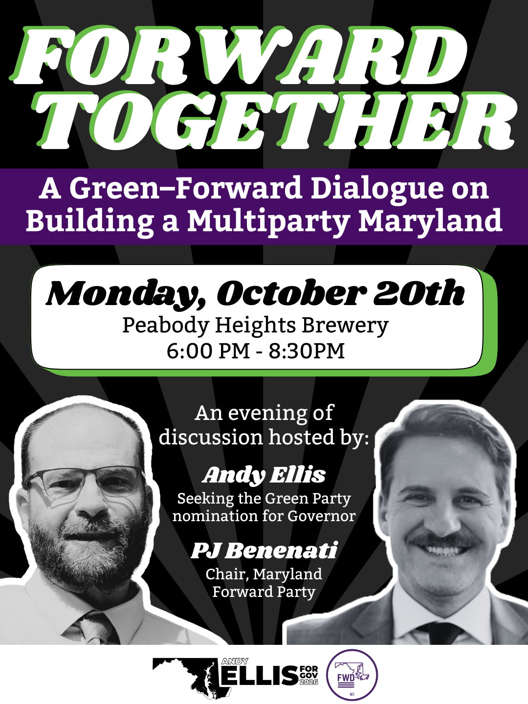 Join us for an evening of connection, conversation, and collaboration between supporters of the Forward Party and the Ellis-Andrews Green Party campaign for Governor. This gathering is about more than one campaign—it’s about advancing a more responsive democracy in Maryland and making the case for a real multiparty system.