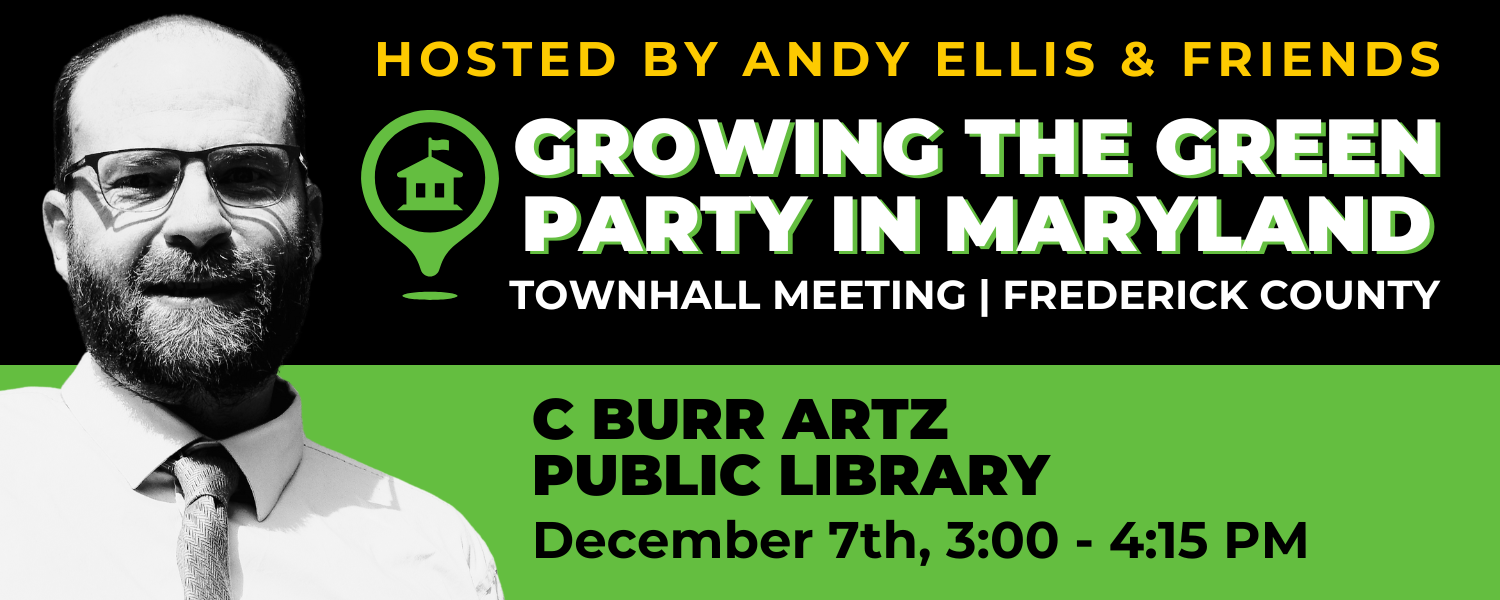 Join us for an interactive, in-person town hall with Brian Bittner, Andy Ellis, Andrew Eneim, and friends as we discuss the Green Party in Maryland.